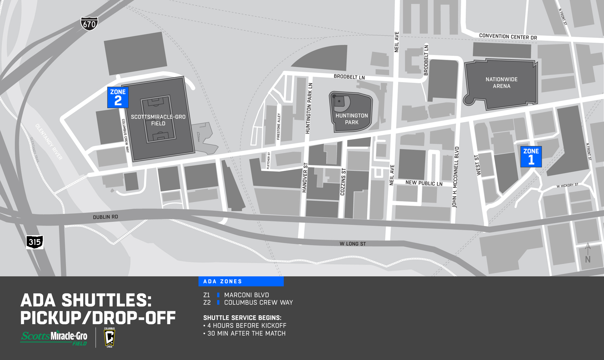 The shuttle service, provided by Cardinal Transit, begins operation four (4) hours prior to kickoff and runs through the duration of the match. Shuttle service resumes 30 minutes following the conclusion of the match, with pick-up located at the northwest corner outside Lower.com Field. The shuttle service runs for four (4) hours following the conclusion of the match.